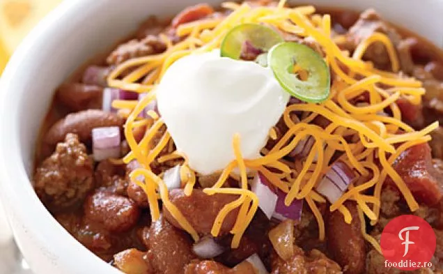 Adăugați roșiile și fasolea. Se amestecă bine, se acoperă și se gătește la foc mic timp de 8 ore. Top chili cu condimente, cum ar fi brânză mărunțită, jalapeos felii, ceapă tăiată cubulețe și smântână.