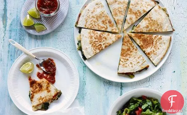 Tăiați quesadillas în pene și serviți cu salata de fasole și escarole și salsa.