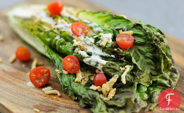 Grătar: salată Romaine cu fermă picantă, roșii și ceapă prăjită