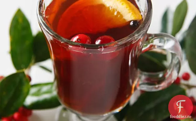 Așezați toate ingredientele, cu excepția coniacului, într-o oală mare, nereactivă sau oală și aduceți la fierbere mică. Reduceți căldura la cea mai mică setare și acoperiți. Se fierbe timp de cel puțin 2 ore (poate fi păstrat într-o oală pentru 4 ore). Cu aproximativ 15 minute înainte de servire, adăugați rachiul și continuați să fierbeți la foc mic. Strecurați condimentele și fructele și serviți cu bețișoare de scorțișoară și felii proaspete de portocală.