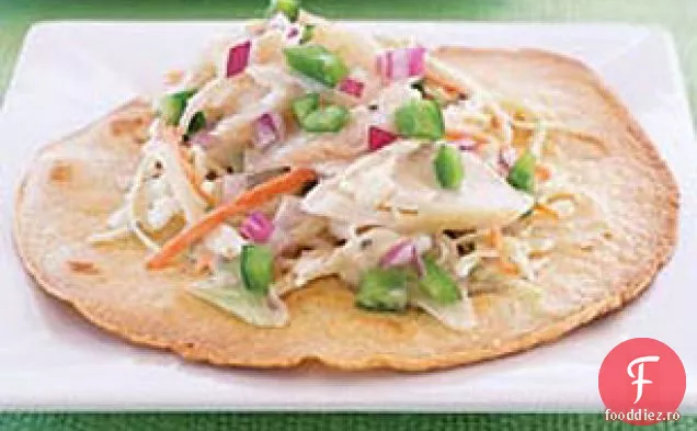 Adăugați pansamentul rămas în amestecul de salată de varză; aruncați ușor. Lingura uniform pe tortilla; top cu amestec de pește, ardei și ceapă.