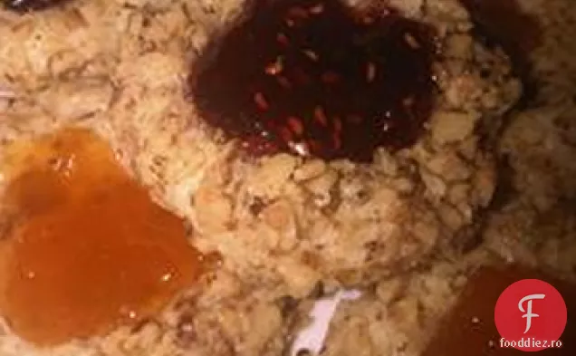 Coaceți timp de 12-15 minute, până când prăjiturile încep să se rumenească pe fund. Îndepărtați cu grijă pe grătar și, în timp ce este fierbinte, umpleți fiecare depresiune cu 1/2 linguriță de conserve de caise sau gemul preferat.