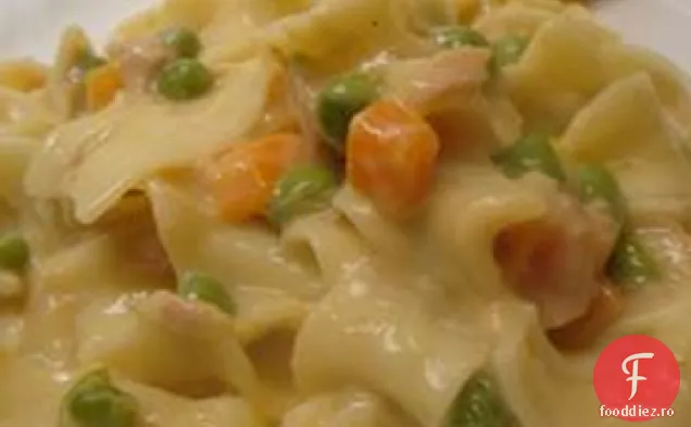 Aduceți la fierbere o oală mare cu apă ușor sărată. Gatiti pastele in apa clocotita pana al dente, adaugand mazare pentru ultimele 3 minute de gatit; scurgere.