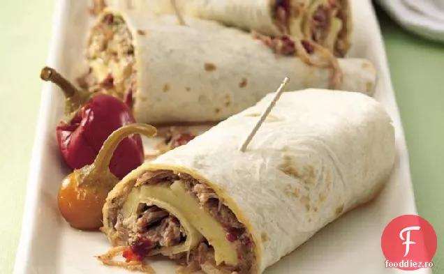 Scoateți curcanul din aragaz; așezați pe scândură. Se taie curcanul, folosind 2 furci. Se amestecă curcanul și condimentul Italian în amestec în aragaz. Folosind o lingură cu fante pentru a îndepărta amestecul de curcan din aragaz, umpleți fiecare tortilla cu aproximativ 2/3 cană de amestec de curcan. Se acoperă cu brânză; rulati.