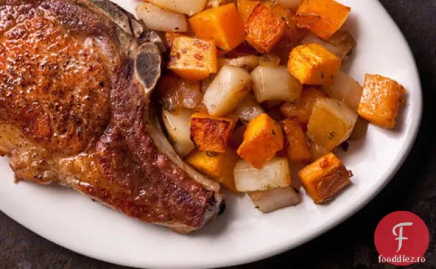 Tăiați ceapa în zaruri medii; pune deoparte. Curățați, miez și tăiați perele în zaruri mari; pus deoparte. Topiți restul de 2 linguri de unt într-o tigaie mare la foc mediu.