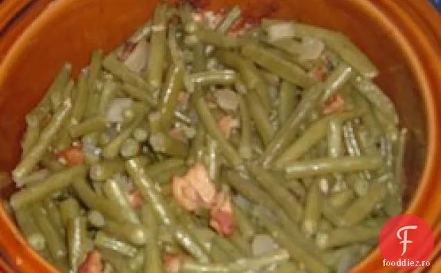 Adăugați slănină, ceapă și usturoi și gătiți până se rumenesc. Amestecați treptat fasolea verde, amestecând pentru a acoperi cu grăsime de slănină. Reduceți căldura la minim, acoperiți și gătiți timp de 5 până la 6 ore, amestecând ocazional pentru a preveni lipirea.