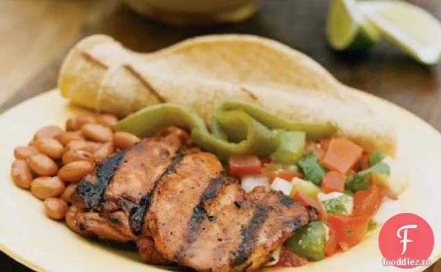 Pe o farfurie cu margini, acoperiți puiul complet cu marinată orange-achiote și acoperiți coapsele; pe o altă farfurie cu margini, acoperiți carnea de porc complet cu sos de chili roșu și felii de strat. Acoperiți și răciți cel puțin 30 de minute sau până la 1 zi (dacă marinați puiul și carnea de porc cu o zi înainte, înfășurați carnea de vită etanșă și răcoriți). Cu puțin timp înainte de grătar, presărați ușor ambele părți de carne de vită cu sare și piper condimentate; așezat pe o farfurie.
