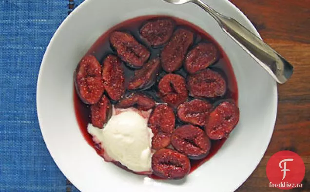 Transferați smochinele în șase boluri de servire cu fețe joase. Se strecoară semințele din lichidul rămas și apoi se readuce în tigaie și se fierbe până se reduce la o cocnsistență siropoasă. Aproximativ 10 minute.