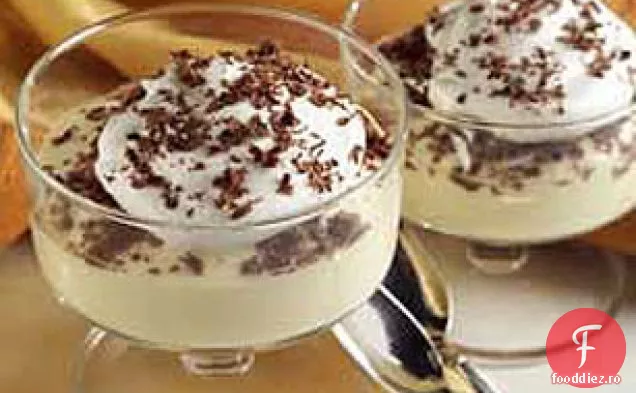 Se Presara 2 Linguri. din ciocolata rasă peste amestecul de budincă; se acoperă cu topping bătut.