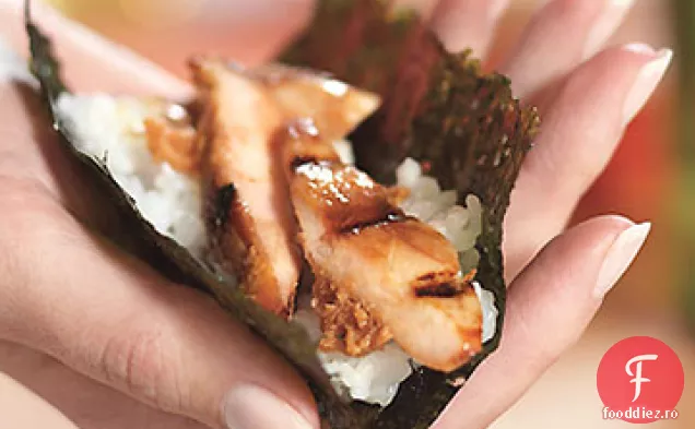 Înfășurați puiul la grătar cu orezul lipicios în ambalaje nori condimentate.