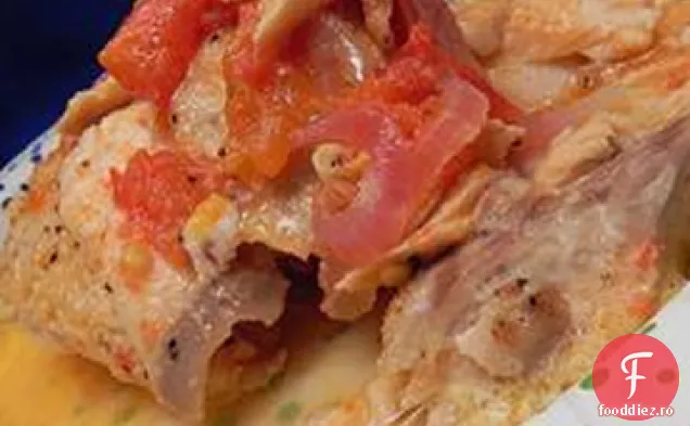 Așezați fileurile de somon într-un vas de copt de 8x8 inci pentru microunde și așezați ceapa și roșiile pe fileuri.