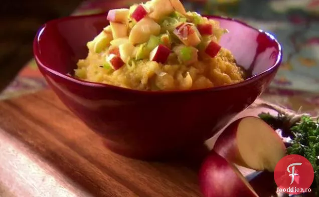 Așezați piureul în vasul de servire și deasupra cu sote de mere și praz.