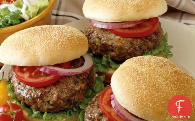 Se serveste in interiorul chifle hamburger acoperit cu salata verde, roșii și Valea ascunse pentru tot Topping și Dip.