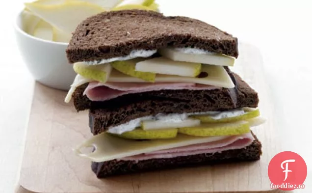 Întindeți amestecul de iaurt pe felii de pâine. Top 1 felie de pâine cu șuncă, jumătate din felii de pere, brânză și felie de pâine rămasă.